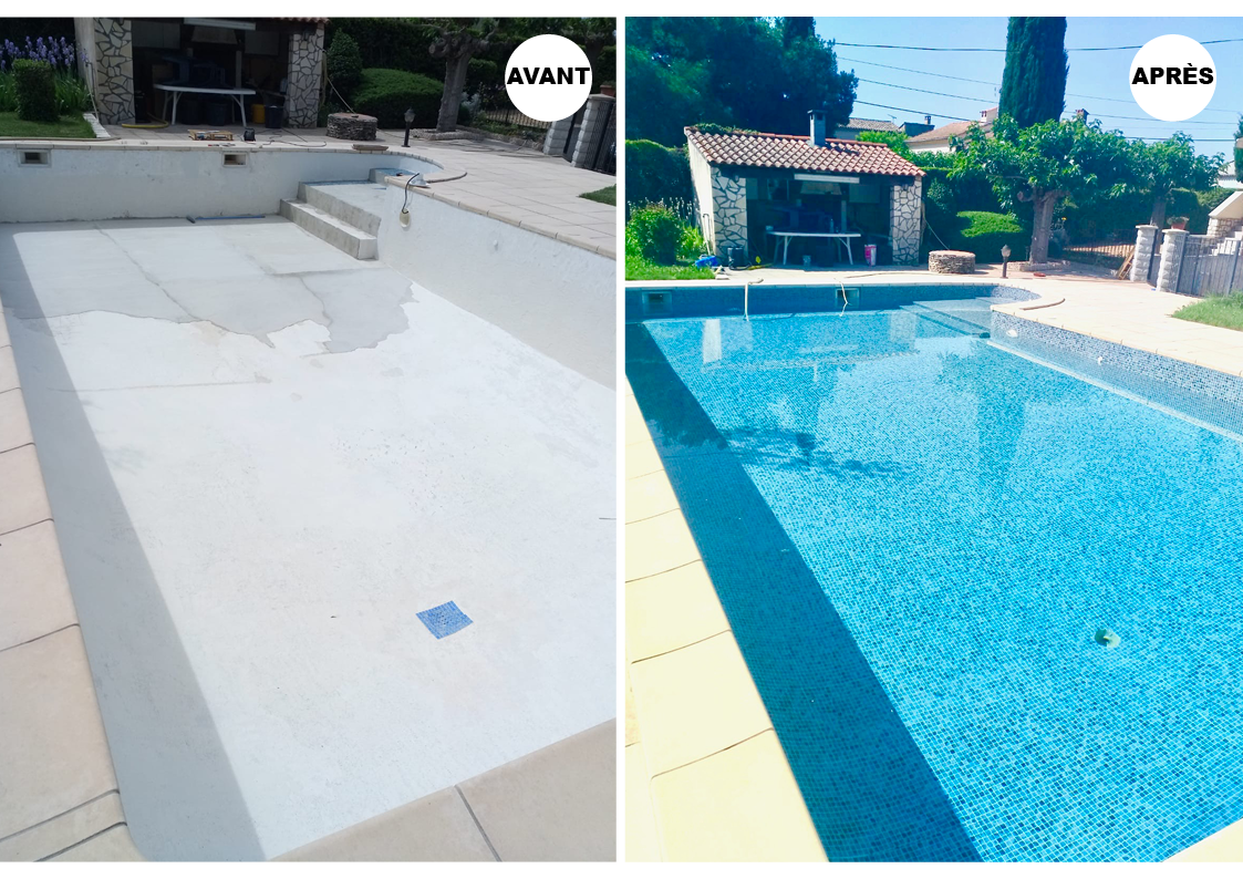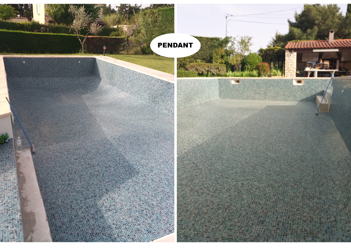 - Retrait de la mosaïque existante sur les escaliers et contour piscine