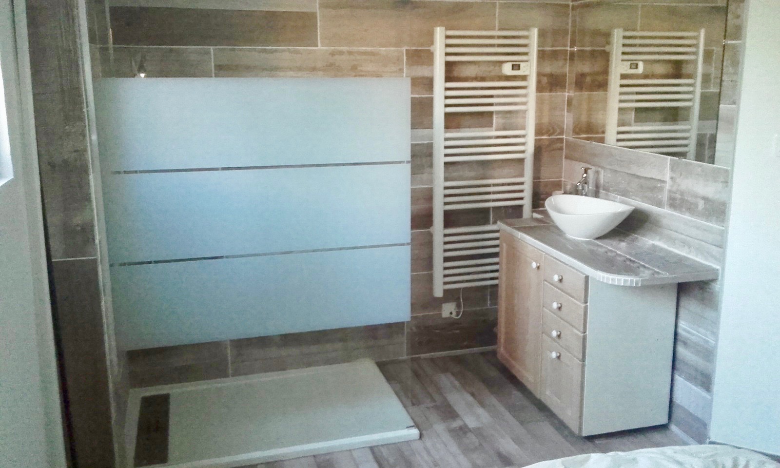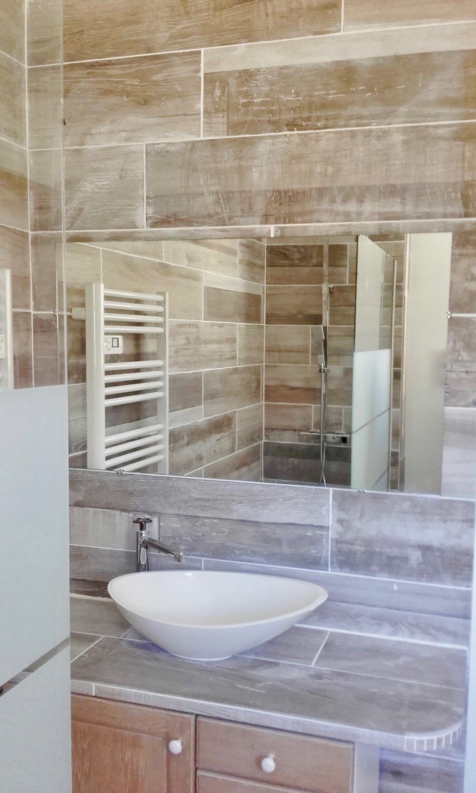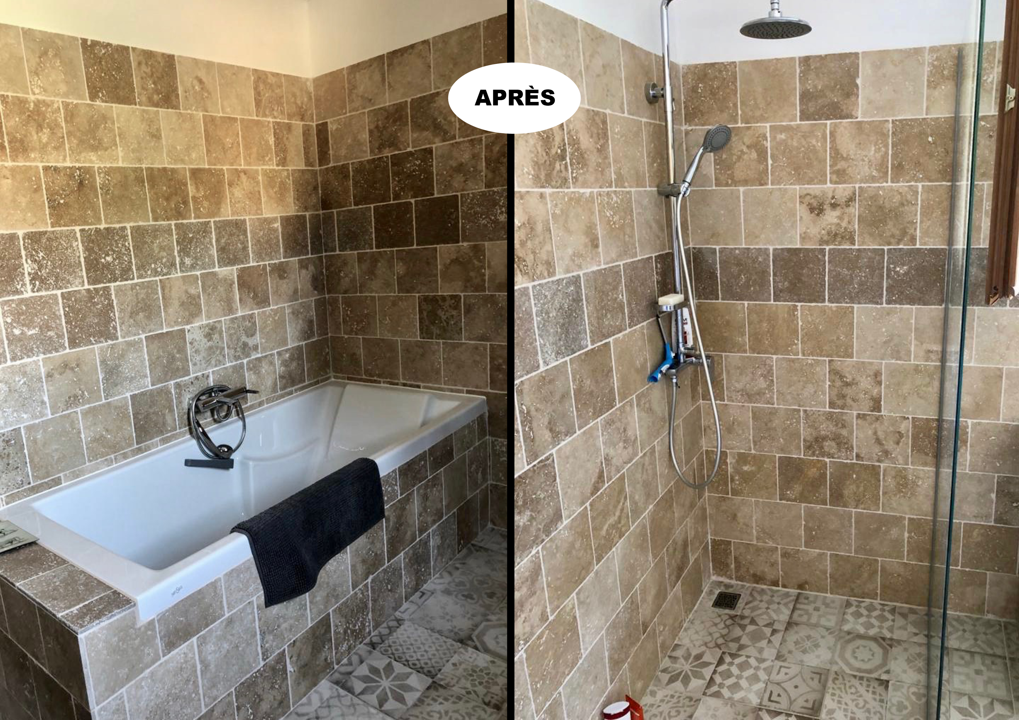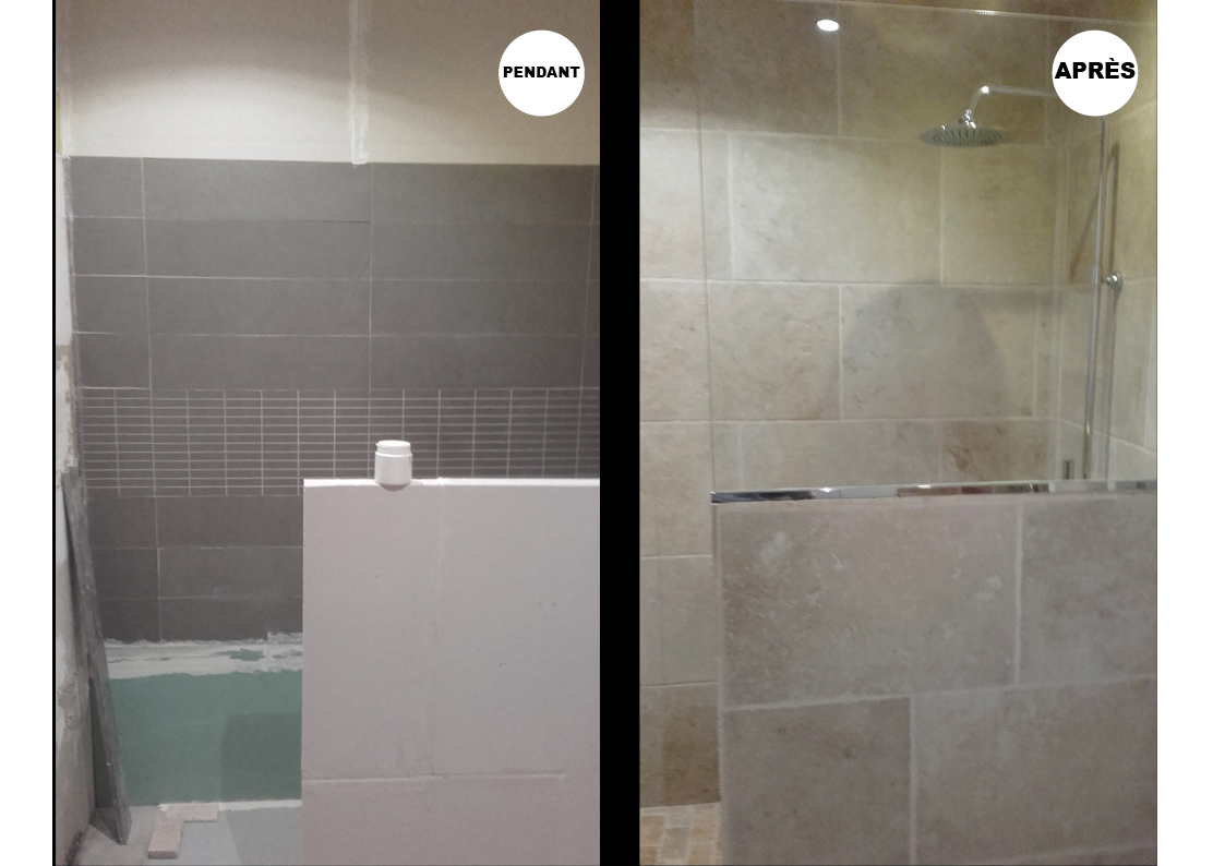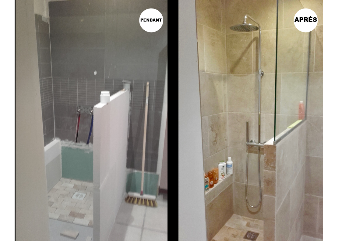 - Création de l’espace douche (construction muret de séparation, murs, sol, plomberie, pose de la vitre, évacuations)