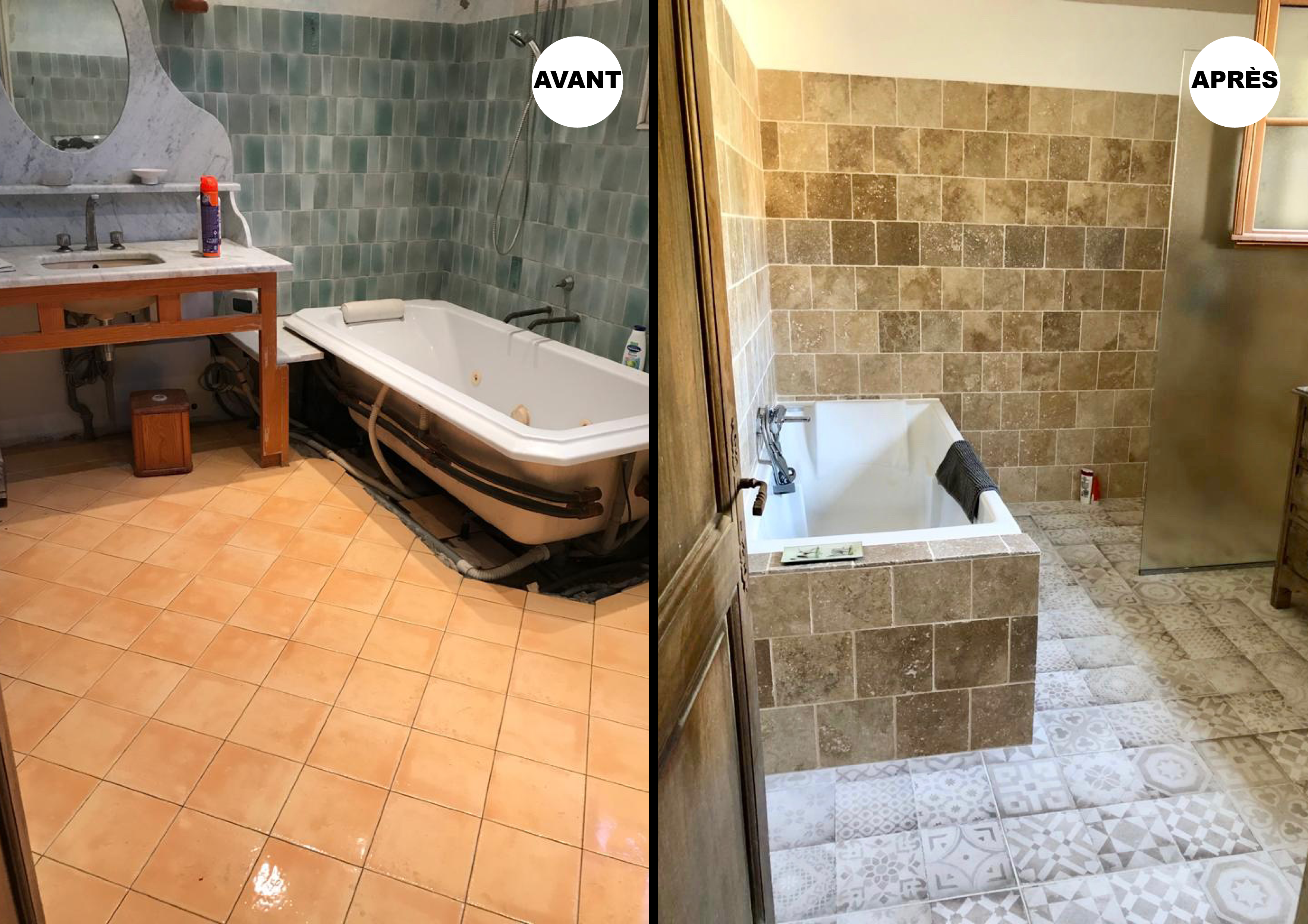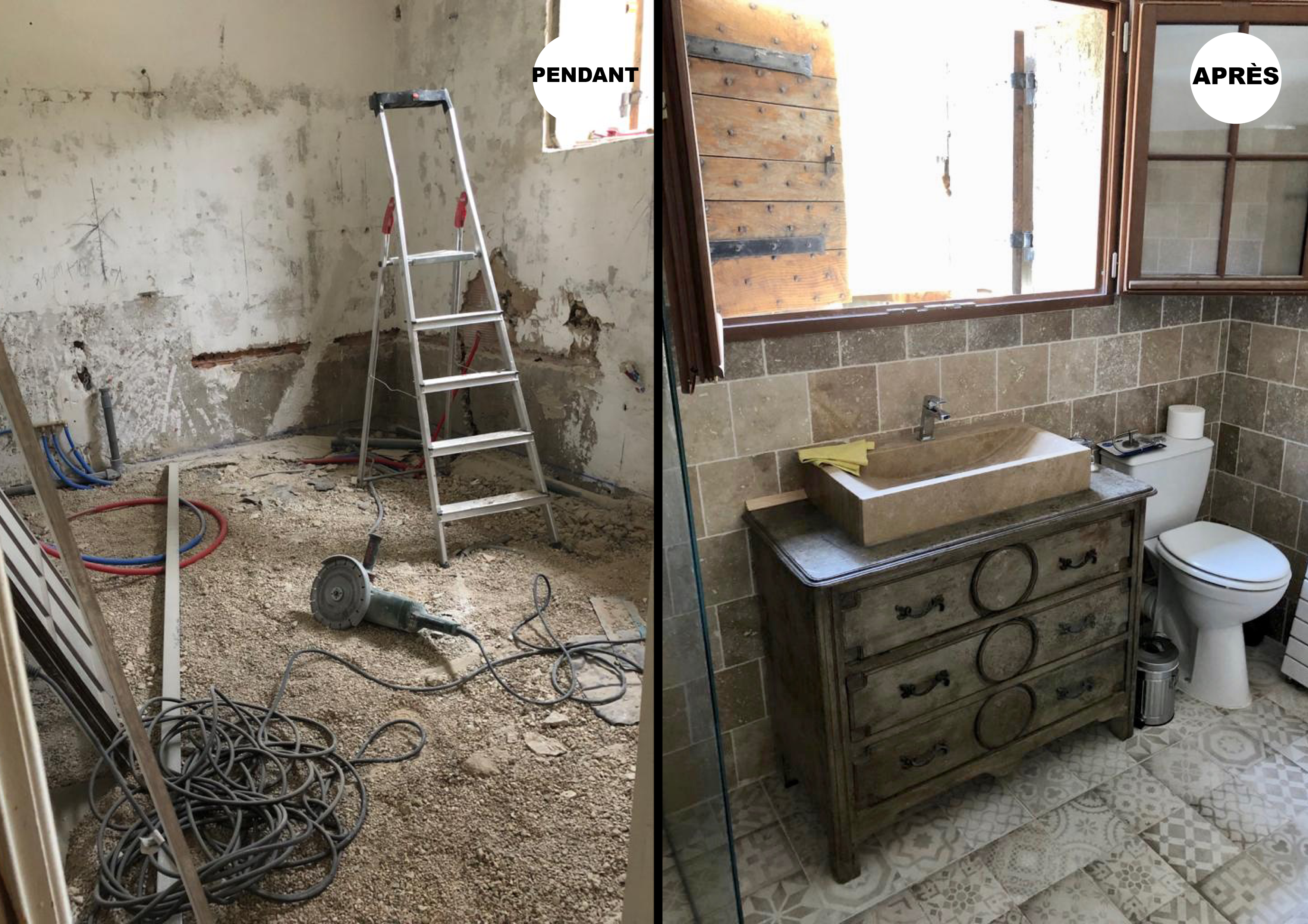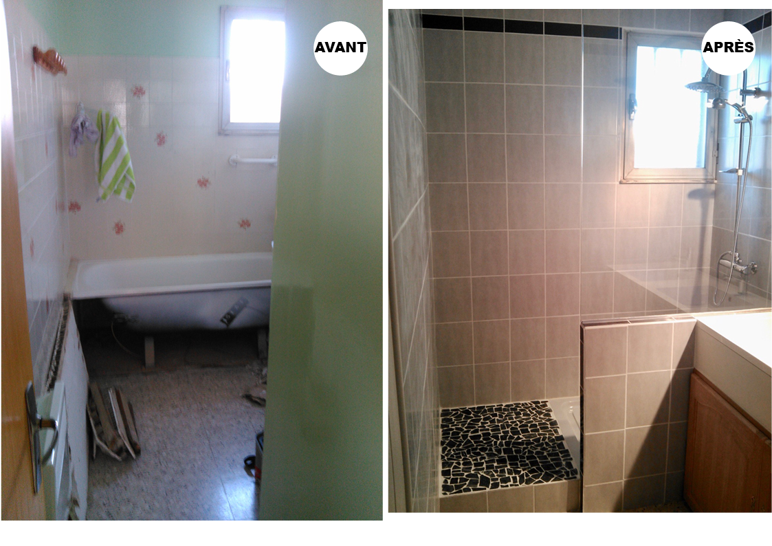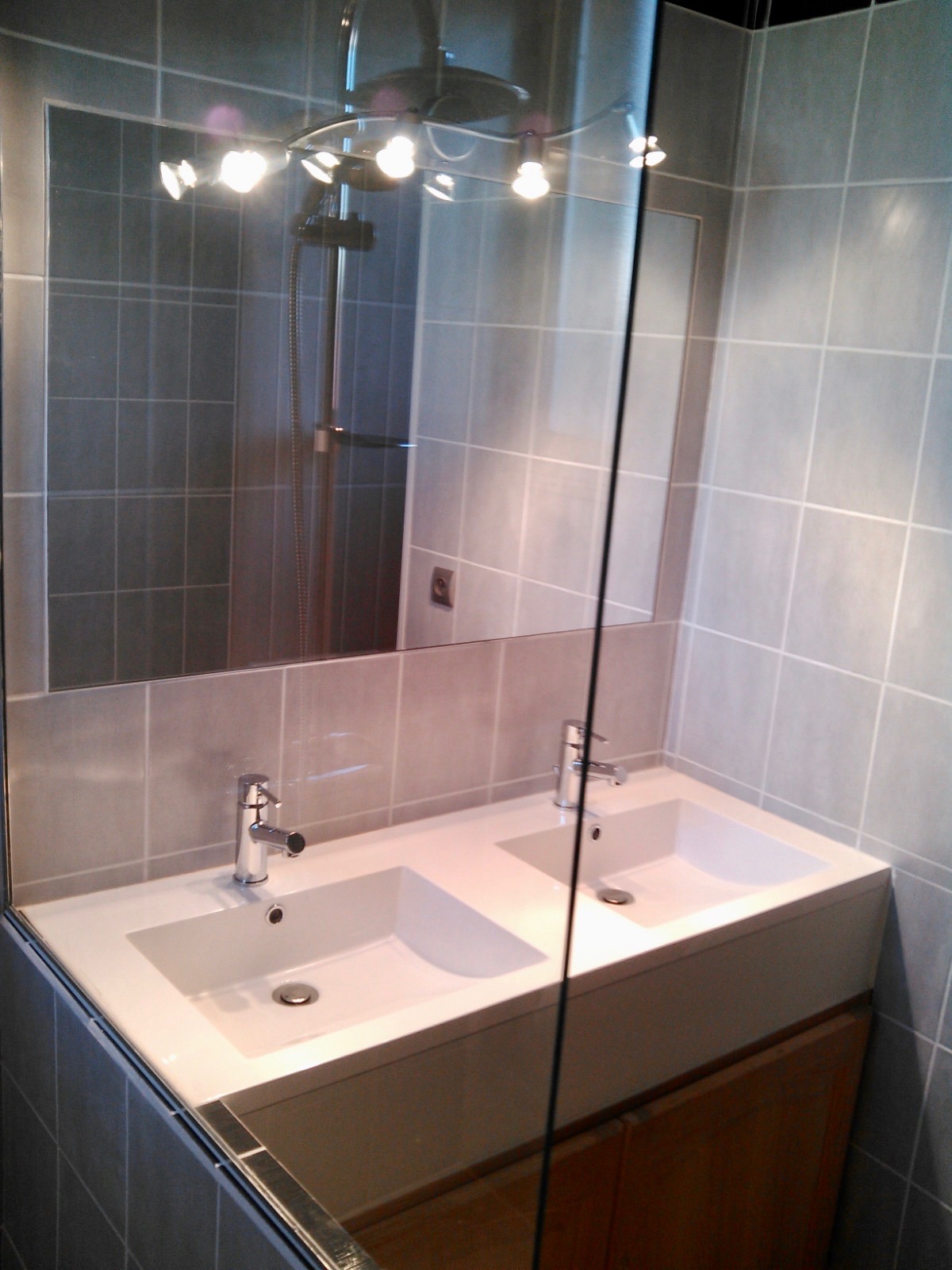 - Création de l’espace douche (construction muret de séparation, murs, sol, plomberie, pose de la vitre, évacuations)