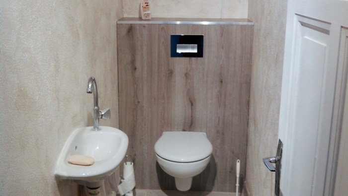 WC suspendu Retrait du carrelage, du WC (sol et mur) et de l’étagèrePose d’un WC suspendu Réalisation et habillage du coffrage (camouflage du mécanisme) CarrelageEnduit ciré au mur